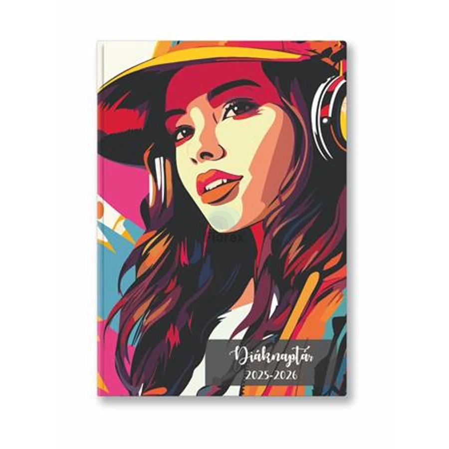 Színes, fóliázott papírborítású diáknaptár fiatalos mintákban.