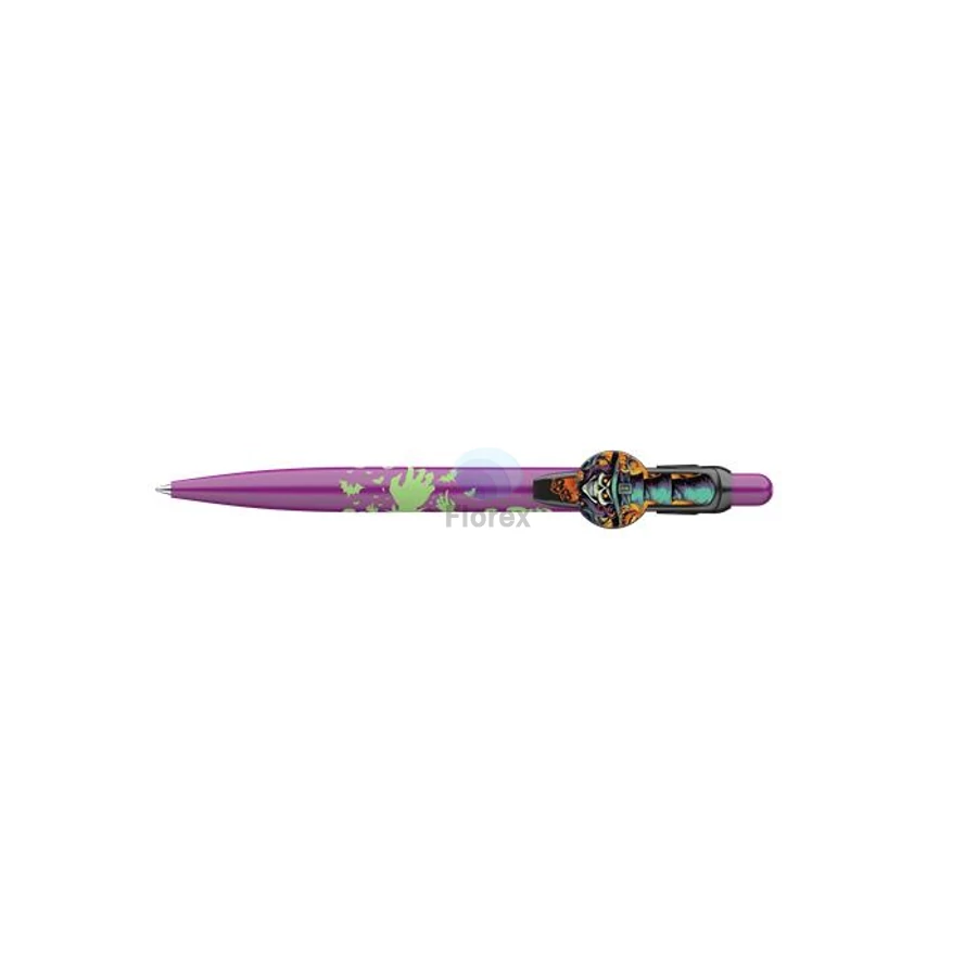 Golyóstoll, 0,8 mm, nyomógombos, lila mintás tolltest, ICO Halloween, kék