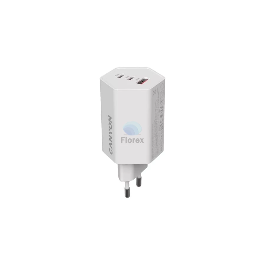 Hálózati töltő, 1xUSB-A, 2xUSB-C, 65W, CANYON "Hexagon 65", fehér