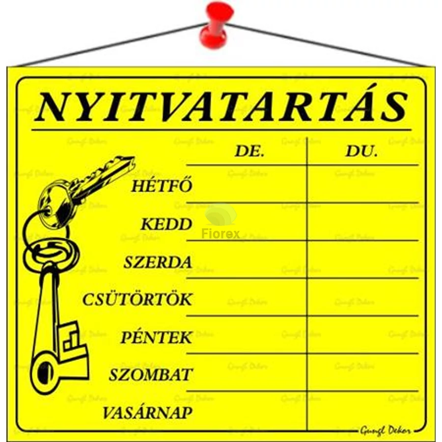 Információs tábla, 20x17,5 cm, "Nyitvatartás", sárga
