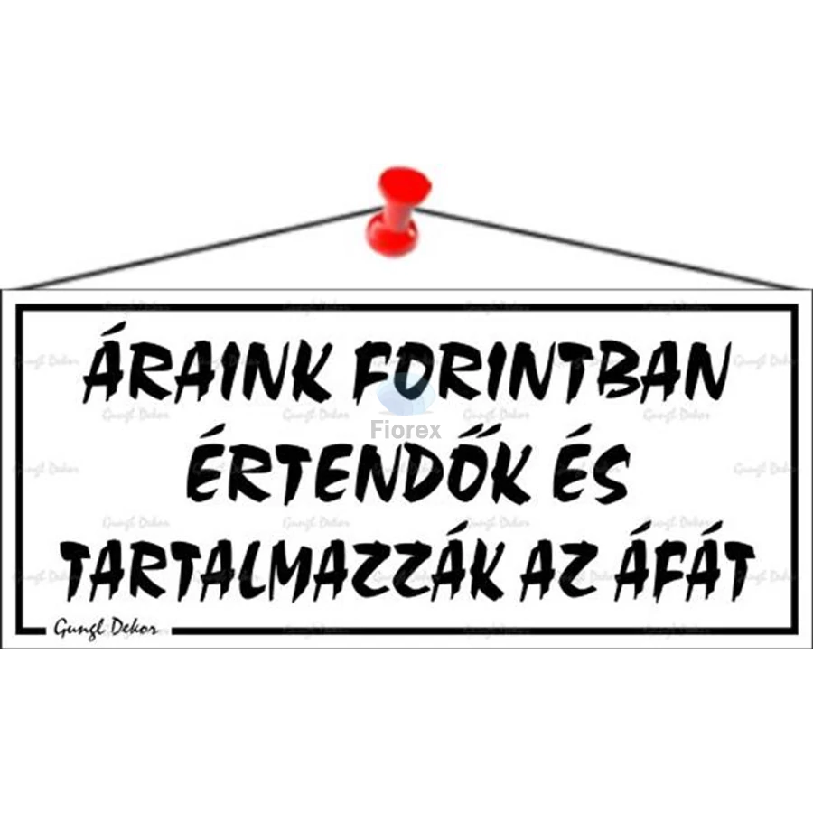 Információs tábla, 22,5x10 cm, "Áraink forintban értendők és tartalmazzák az áfát", fehér