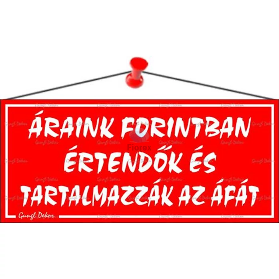 Információs tábla, 22,5x10 cm, "Áraink forintban értendők és tartalmazzák az áfát", piros