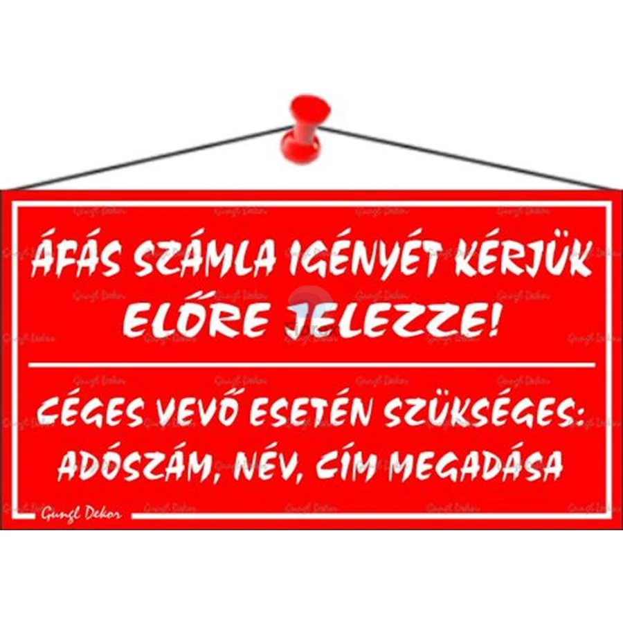 Információs tábla, 22,5x12,5 cm, "ÁFÁS számla igényét kérjük előre jelezze!", piros