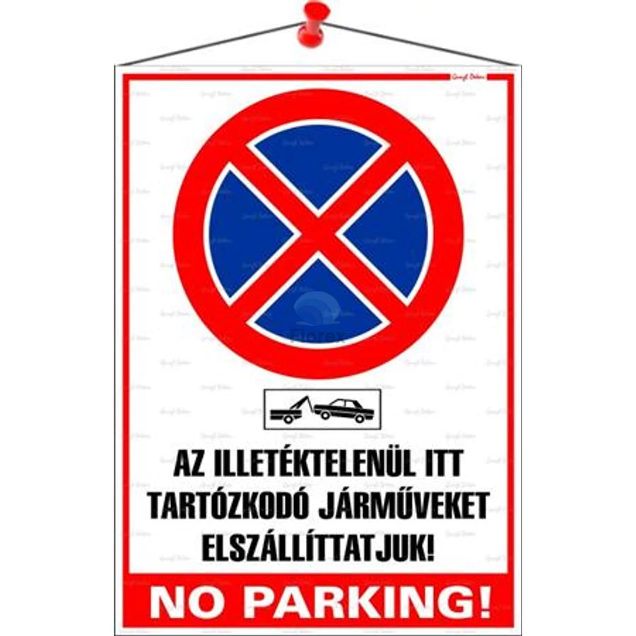 Az illetéktelenül itt tartózkodó járműveket elszállíttatjuk! No parking! információs tábla