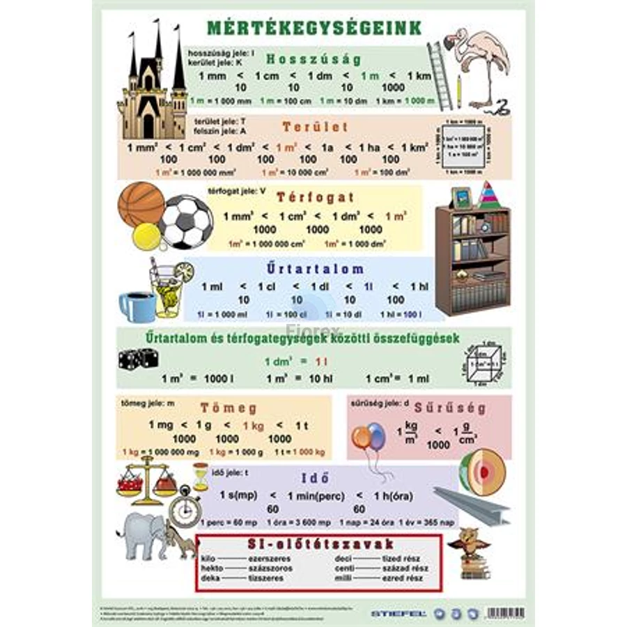 A mértékegységek áttekintése szemléletes rajzokkal, amelyek segítenek a tanultak rögzülésében. Hátoldalán gyakorló oldallal