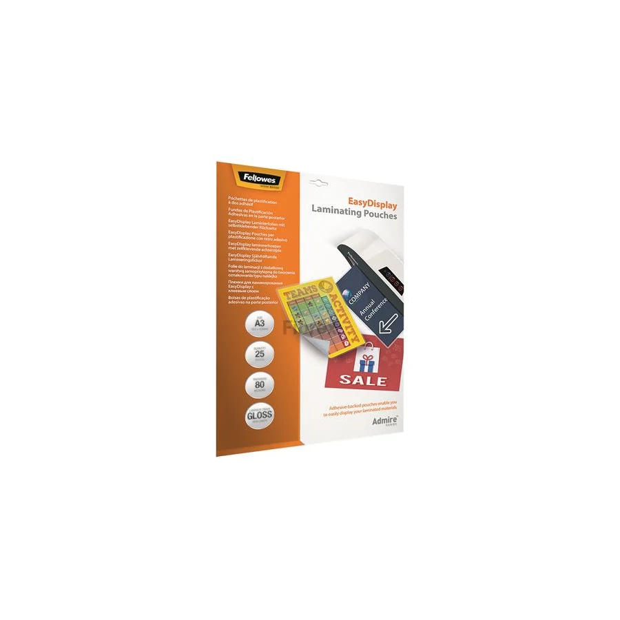 Meleglamináló fólia, 80 mikron, A3, fényes, öntapadó, FELLOWES "Admire Easy Display" - 25db
