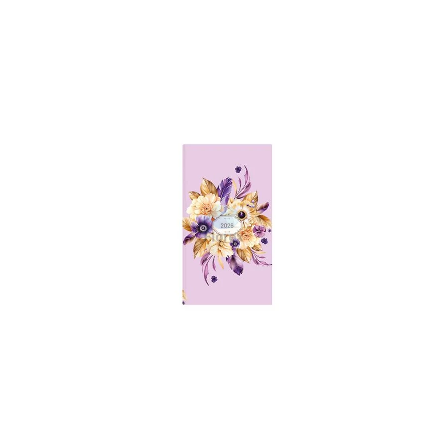 Színes grafikával díszített, matt fóliával bevont, fehér tömbös zsebnaptár, jelzőszalaggal.